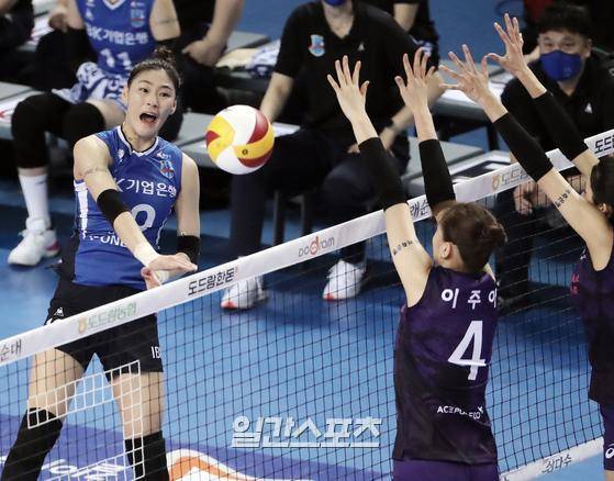 2020~2021 프로배구 V리그 여자부 기업은행과 흥국생명의 경기가 17일 오후 경기화성실내체육관에서 열렸다. 김주향이 블로킹을 피해 스파이크 공격을 하고 있다.