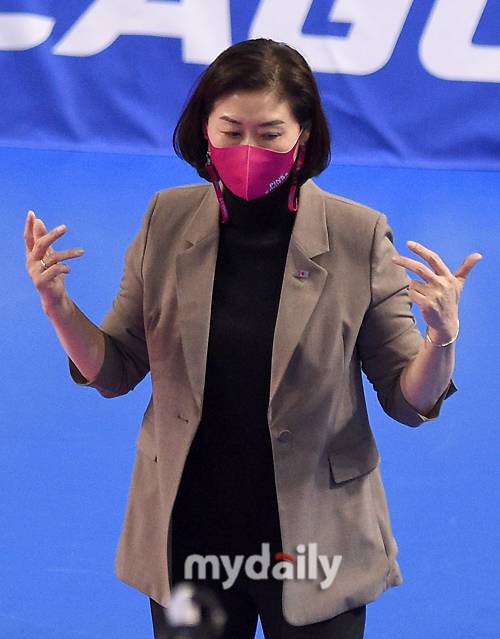 [MD포토] 박미희 감독 '승리의 기운이 나에게로 왔어'