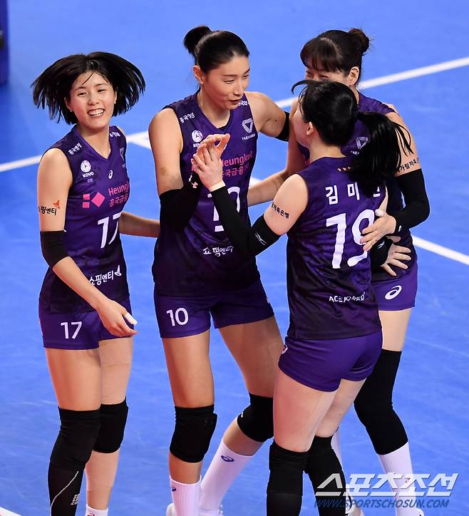 프로배구 여자부 IBK기업은행과 흥국생명의 경기가 17일 화성종합경기타운 실내체육관에서 열렸다. 흥국생명 선수들이 공격을 성공한 후 기쁨을 나누고 있다. 화성=허상욱 기자 wook@sportschosun.com/2021.01.17/