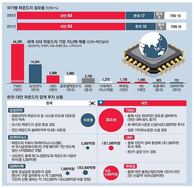 이런 가운데 대만 기업은 앞다퉈 파운드리 투자 계획을 내놓고 있다. 파운드리 시장 54%를 장악한 TSMC는 올해 250억~280억달러(최대 30조원)를 설비 투자에 쏟는다고 선언했다. 전년 대비 62% 증액한 수치다. TSMC는 지난해 5월 120억달러를 투자해 미국 애리조나에 5나노미터(㎚·1㎚는 10억분의 1m) 이하 초미세 공정 반도체를 생산하는 신공장을 짓는다고 발표했다.