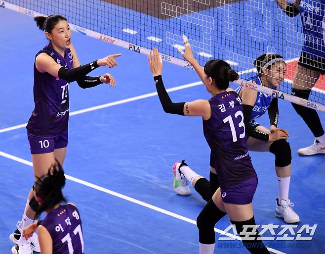 프로배구 여자부 IBK기업은행과 흥국생명의 경기가 17일 화성종합경기타운 실내체육관에서 열렸다. 흥국생명 선수들이 공격을 성공한 후 기쁨을 나누고 있다. 화성=허상욱 기자 wook@sportschosun.com/2021.01.17/