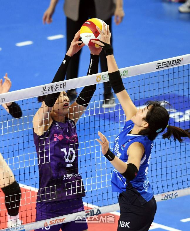 흥국생명 김연경이 17일 화성실내체육관에서 열린 2020-2021 V리그 여자부 IBK기업은행과 흥국생명의 경기에서 상대 조송화와 볼다툼을 하고 있다.