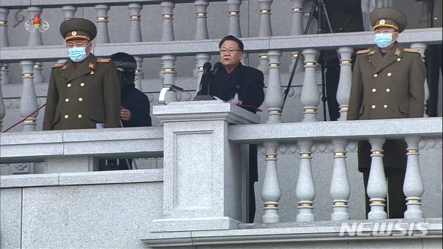 [서울=뉴시스]조선중앙TV가 17일 북한 평양 김일성광장에서 노동당 제8차대회 결정을 철저히 관철하기 위한 평양시군민연합대회를 개최했다고 보도했다. 사진은 최룡해 최고인민회의 상임위원회 위원장이 연설하는 모습. (사진=조선중앙TV 캡쳐) 2020.11.17. photo@newsis.com