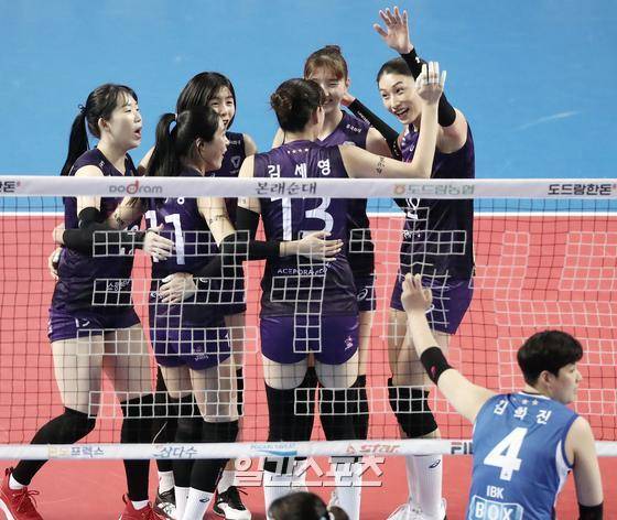 2020~2021 프로배구 V리그 여자부 기업은행과 흥국생명의 경기가 17일 오후 경기화성실내체육관에서 열렸다. 김연경이 김세영이 블로킹 득점을 올리자 동료들과 함께 기뻐하고 있다.