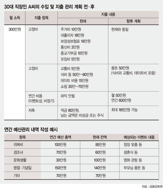 A씨의 월 평균 수입은 300만원이다. 고정 지출은 주거비 10만원, 대출이자 18만원, 보장성 보험료 19만원, 통신비 3만원 등 65만원이다. 변동 지출은 교통비 5만원, 식비 등 50만~80만원, 데이트 비용 15만원 등 100만~170만원이다. 매월 80만원을 저축한다.