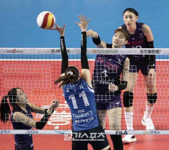 2020~2021 프로배구 V리그 여자부 기업은행과 흥국생명의 경기가 17일 오후 경기화성실내체육관에서 열렸다. 김미연이 속공으로 득점하고 있다.