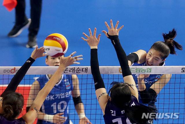 [서울=뉴시스]기업은행 육서영이 17일 경기 화성시 화성실내체육관에서 열린 2020-21 도드람 V리그 흥국생명과의 경기에서 스파이크를 하고 있다. (사진=기업은행 배구단 제공) 2020.11.17. photo@newsis.com