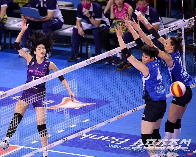 프로배구 여자부 IBK기업은행과 흥국생명의 경기가 17일 화성종합경기타운 실내체육관에서 열렸다. 흥국생명 이재영이 IBK기업은행 김희진, 라자레바의 블로킹 사이로 공격을 시도하고 있다. 화성=허상욱 기자 wook@sportschosun.com/2021.01.17/