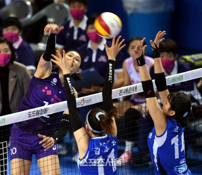 흥국생명 김연경이 17일 화성실내체육관에서 열린 2020-2021 V리그 여자부 IBK기업은행과 흥국생명의 경기에서 스파이크를 날리고 있다.