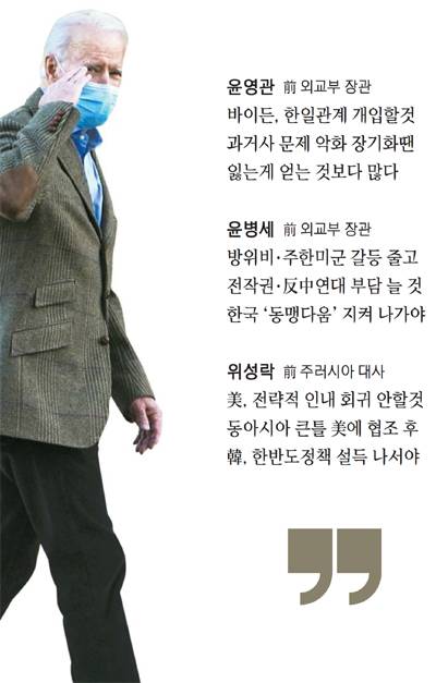 위성락: 바이든 행정부는 관계를 복원하도록 독려할 것이나 압력은 한국 쪽에 더 기울 것이다. 국제적으로는 절차나 형식 측면에서 일본의 주장이 더 설득력이 있는 것으로 비춰지기 때문이다. 미국의 압박이 가중되면 한국은 끌려가지 않을 수 없을 것이다. 그러니 기다리기 보다 선제적으로 문제를 풀어야 바이든 당선인의 신뢰도 얻을 수 있다.