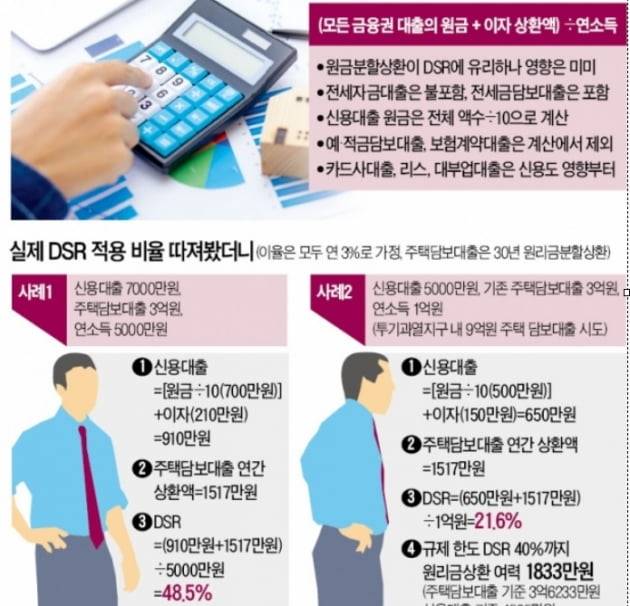DSR은 어떻게 계산할까. 연소득 5000만원인 직장인 A씨(사례1)의 사례를 들어보자. A씨는 연 3% 금리로 7000만원의 신용대출을 이용하고 있고 원리금균등상환 방식의 주택담보대출 3억원(연 3%)을 받았다. A씨는 신용대출만으로 한 해에 910만원의 원리금을 상환해야 한다. 여기에 주택담보대출 원리금 1517만원을 더하면 전체 대출 상환액은 2427만원이다. A씨의 DSR은 48.54%(2427만원÷5000만원)가 된다.