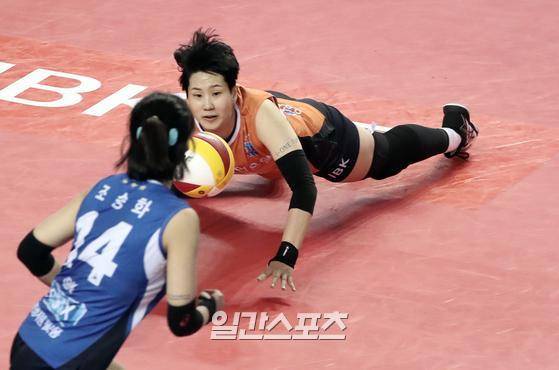 2020~2021 프로배구 V리그 여자부 기업은행과 흥국생명의 경기가 17일 오후 경기화성실내체육관에서 열렸다. 리베로 신연경이 몸을 날려 공을 살려내고 있다.
