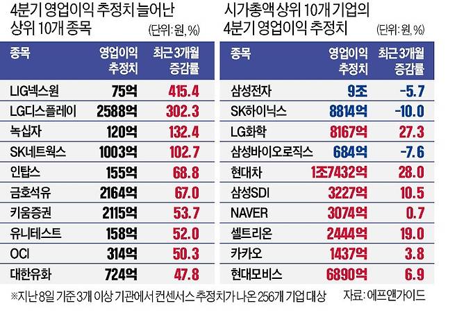LG디스플레이도 영업이익 추정치가 최근 상향 조정됐다. 매출의 17%를 차지하는 LCD(액정표시장치) TV 패널 가격이 지난해 하반기 97% 상승한 덕분에 영업이익 추정치가 3개월 새 302.3% 폭증했다. 4분기 매출은 전년 동기 대비 10.6% 늘어난 7조1023억원, 영업이익은 흑자전환에 성공해 2588억원에 달할 전망이다. 김민규 KB증권 연구원은 “4분기 계절성을 감안해 성장을 보수적으로 계산해도 실적 개선이 기대되는 종목”이라고 평가했다.