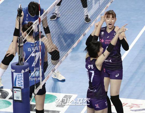2020~2021 프로배구 V리그 여자부 기업은행과 흥국생명의 경기가 17일 오후 경기화성실내체육관에서 열렸다. 이재영이 라자레자의 공격을 블로킹해 득점을 올린 후 기뻐하고 있다.