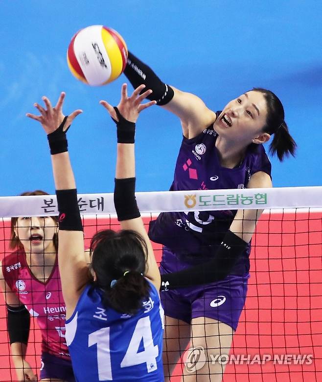 (화성=연합뉴스) 홍기원 기자 = 17일 경기도 화성종합경기타운 실내체육관에서 열린 프로배구 V리그 여자부 IBK기업은행 알토스와 흥국생명 핑크스파이더스의 경기. 흥국생명 김연경이 공격을 하고 있다. 2021.1.17