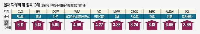 지난해 말 배당수익률을 기준으로 올해 다우의 개로 선정된 종목은 셰브런, IBM, 다우, 월그린부츠얼라이언스, 버라이즌, 3M, 시스코, 머크, 암젠, 코카콜라 등 10개다. 다우존스30 종목 중 지난해 12월 말까지 배당수익률이 가장 높았던 종목이다. 셰브런의 배당수익률이 6.11%로 가장 높았고, 코카콜라가 2.99%로 10위를 차지했다. 평균 배당률은 4.1% 수준이다. 화이자와 엑슨모빌은 지난해 다우지수에서 퇴출되면서 목록에서 빠졌다. 대신 머크와 암젠이 들어갔다.