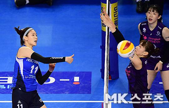IBK기업은행 김수지가 상대 블로커를 앞에 두고 스파이크를 날리고 있다.