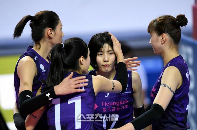 흥국생명 이다영이 17일 화성실내체육관에서 열린 2020-2021 V리그 여자부 IBK기업은행과 흥국생명의 경기에서 득점 후 이재영과 하이파이브를 하고 있다.