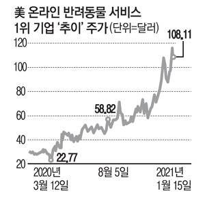 온라인에 특화돼 반려동물 업계 아마존으로 불리는 '추이(Chewy)'는 지난 15일 108.11달러에 거래를 마감했다. 올해 들어서만 주가가 19.7% 오른 것이다. 추이는 오프라인 1위 업체 펫스마트가 2017년 33억5000만달러에 인수했다.