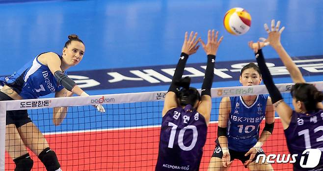 (서울=뉴스1) 민경석 기자 = 17일 경기 화성 실내체육관에서 열린 도드람 2020-21 V리그 기업은행과 흥국생명의 경기에서 기업은행 라자레바가 공격을 시도하고 있다.(기업은행 배구단 제공)2021.1.17/뉴스1