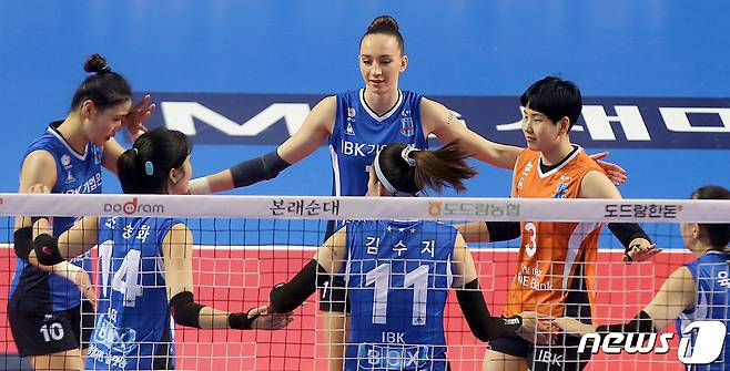 (서울=뉴스1) 민경석 기자 = 17일 경기 화성 실내체육관에서 열린 도드람 2020-21 V리그 기업은행과 흥국생명의 경기에서 기업은행 선수들이 득점에 성공한 뒤 기뻐하고 있다.(기업은행 배구단 제공)2021.1.17/뉴스1
