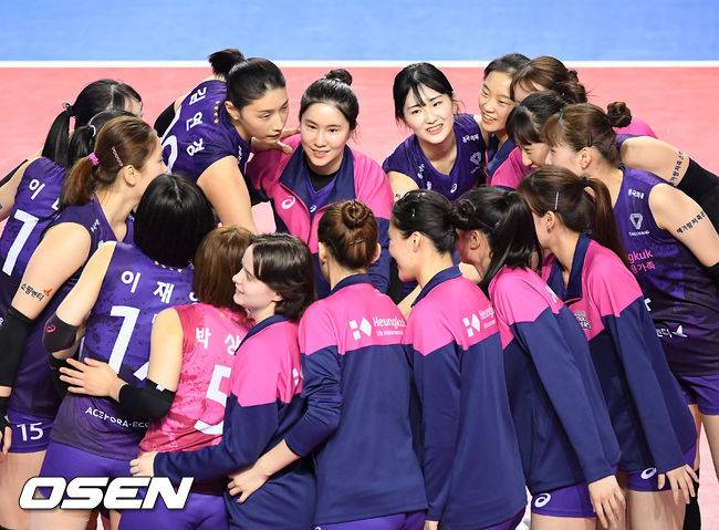 경기를 마치고 흥국생명 선수들이 승리의 기쁨을 나누고 있다.