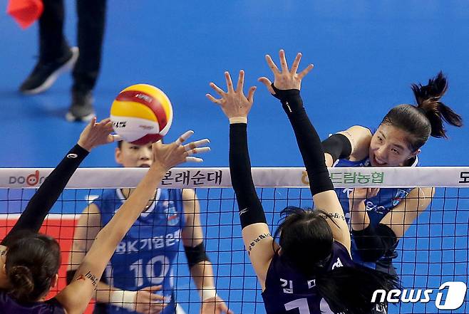 (서울=뉴스1) 민경석 기자 = 17일 경기 화성 실내체육관에서 열린 도드람 2020-21 V리그 기업은행과 흥국생명의 경기에서 기업은행 육서영이 공격을 시도하고 있다.(기업은행 배구단 제공)2021.1.17/뉴스1
