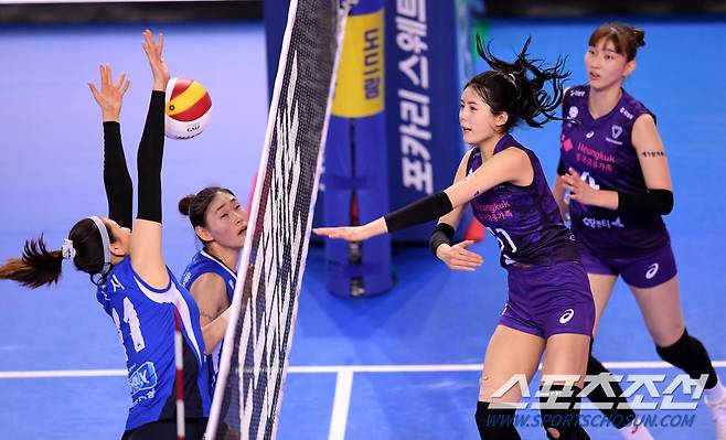 프로배구 여자부 IBK기업은행과 흥국생명의 경기가 17일 화성종합경기타운 실내체육관에서 열렸다. 흥국생명 이다영이 IBK기업은행 김수지의 블로킹 사이로 공격을 시도하고 있다. 화성=허상욱 기자 wook@sportschosun.com/2021.01.17/