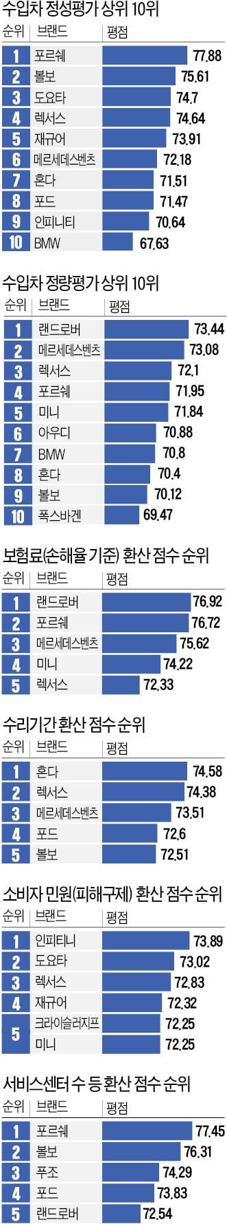 포르쉐에 이어 2~4위를 기록한 렉서스, 볼보(72.86점), 메르세데스벤츠(72.63점)는 과거 평가에서도 꾸준히 최상위권에 올랐다. 대체로 소비자 만족도에서 높은 점수를 받은 덕분이다. 이 소장은 “‘톱 4’가 어느 정도 자리를 잡았다”며 “소비자가 서비스센터를 이용하면서 느낀 불만을 적극 개선해 안정적인 상위권을 유지하고 있다”고 평가했다.