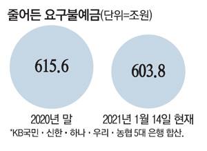 17일 금융권에 따르면 KB국민·신한·하나·우리·농협 5대 시중은행의 요구불예금 잔액 수위가 올 들어 빠르게 낮아지고 있다. 언제라도 뺄 수 있어 단기자금 성격을 지닌 요구불예금 잔액은 작년 말 615조5798억원에서 지난 14일 603조8223억원을 기록해 보름도 안 돼 11조7575억원이 급감했다.