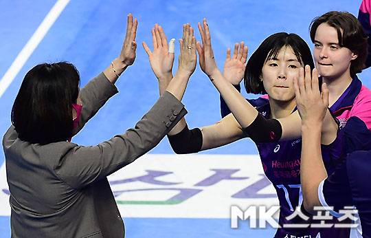 흥국생명 박미희 감독과 이재영이 승리의 하이파이브를 하고 있다.