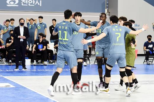 [마이데일리 = 천안 곽경훈 기자] 현대캐피탈이 17일 오후 충청남도 천안시 천안유관순체육관에서 진행된 '2020-2021 도드람 V-리그' 현대캐피탈-한국전력의 경기에서 승리한뒤 기뻐하고 있다.- ⓒ마이데일리(www.mydaily.co.kr). 무단전재&재배포 금지 -