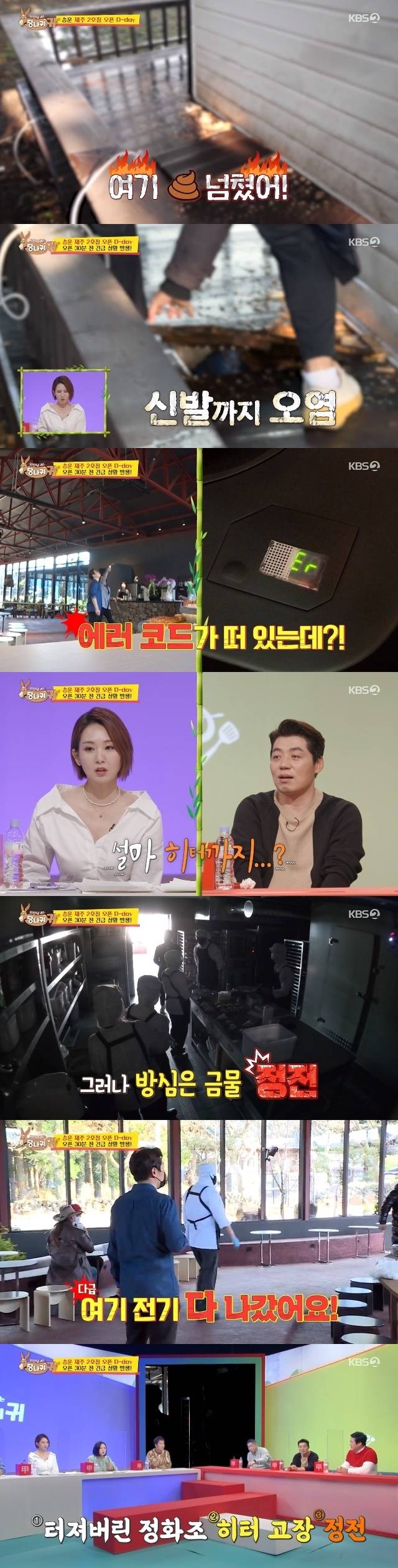 이 뿐만이 아니었다. 히터는 에러가 생기고, 잘 굴러가는 듯했던 베이커리 쪽에선 정전이 발생했다. 전기가 다 나간 상황이었다. 이를 스튜디오에서 지켜보던 오정연은 "이 정도로 악재가 터진다고요?"라며 눈으로 보고도 믿을 수 없는 상황에 함께 당황했다. (사진=KBS 2TV '사장님 귀는 당나귀 귀' 캡처)