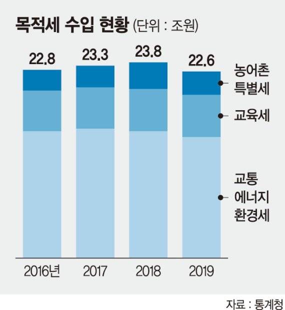 이런 현상은 교육세에 국한된 얘기는 아니다. 농어촌특별세, 교통에너지환경세 등 다른 목적세도 마찬가지다. 농특세는 1994년 우루과이라운드 타결로 농산물시장 개방이 확정되자 농민을 지원하기 위해 10년 한도로 도입됐다. 하지만 농업개방(1997년)이 이뤄진 지 20년이 지난 지금까지도 운영 중이다. 휘발유와 경유에 매기는 교통·에너지·환경세 역시 1994년 도입 때부터 목적(교통시설 확충)은 끝났는데도 여전히 주요 세목으로 자리잡고 있다.