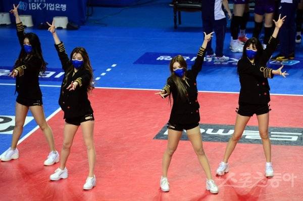 17일 경기도 화성종합실내체육관에서 ‘2020-2021 도드람 V리그’ 화성 IBK기업은행과 인천 흥국생명의 여자부 경기가 열렸다. IBK기업은행 치어리더가 화려한 공연을 선보이고 있다.