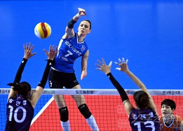 IBK기업은행 라자레바가 흥국생명 블로커를 피해 스파이크를 날리고 있다.