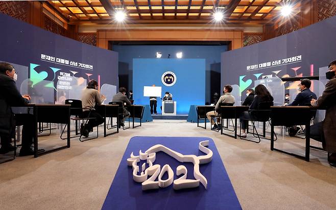 | 리허설 문재인 대통령의 2021 신년 기자회견을 하루 앞둔 17일 청와대 관계자들이 춘추관에서 리허설을 진행하고 있다. 청와대사진기자단 |