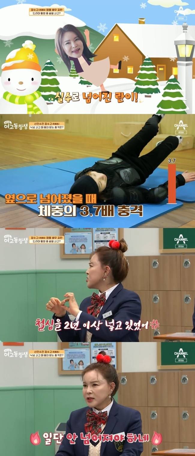 최란은 옆으로 넘어지는 자세를 보면서 "나도 드라마 '마이걸' 때 저렇게 넘어졌다. 눈길에서 걷다가 넘어졌다. 엄지가 완전히 꺾여서 2년 동안 철심을 박고 있었다. 지금도 엄지를 못 쓴다"고 말했다.