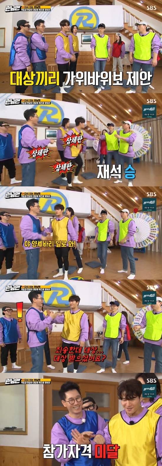이어 유재석&양세찬이 노래를 맞혔다. 하지만 김종국은 "이번 건 카운트가 너무 길었다"라며 답이 늦었다고 항의했고, 제작진은 "대상끼리 가위바위보 해라"라고 밝혔다. 유재석이 이기자 김종국은 바로 "삼 세판"이라며 유재석을 붙잡았다. 지석진은 양세찬에게 가위바위보를 하자고 했다. 그러자 김종국은 "죄송한데 대상 받으셨어요?"라고 했고, 지석진은 "접종 대상"이라고 말해 웃음을 안겼다. 양세찬은 "하고 싶으면 형이 와라"라며 달아났고, 지석진은 자존심을 내려놓고 양세찬을 따라갔다. 결국 지석진은 양세찬을 잡았지만, 가위바위보에서 졌다.