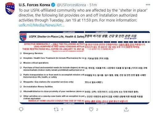 17일 주한미군 트위터에 따르면 주한미군 사령부는 용산과 평택 기지와 관련된 인원에게 전날부터 19일 오후 11시 59분까지 일부 필수 활동을 제외하고는 자택에 머물라는 지침을 내렸다. 2021.1.17 [주한미군 트위터 캡처. 재판매 및 DB 금지]