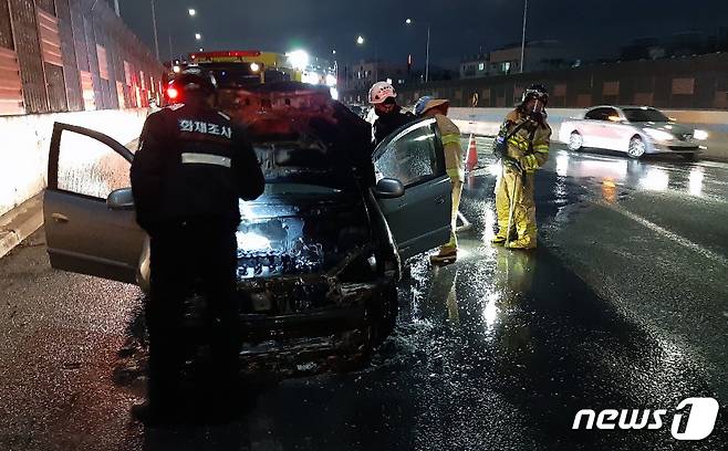 (부천=뉴스1) 정진욱 기자 = 17일 오후 5시 49분쯤 경기도 부천시 원종동 경인고속도로(인천→서울방향) 갓길에 정차한 레조 승용차에서 화재가 발생했다. 현장에 출동한 소방대원이 화재를 진압하고 있다. (경기부천소방서제공) 2021.1.17/뉴스1