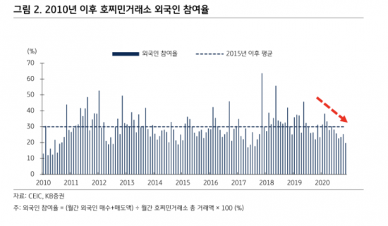 베트남에서도 저금리 기조에 따른 주식시장으로의 자금 쏠림 현상이 지수 상승을 견인하고 있다. 지난해 현지 개인투자자의 월평균 신규 계좌는 3만3000개로 집계됐는데 2017년과 2019년엔 2만개에 불과했다. 특히 하반기에 계좌 개설이 집중됐는데 1월부터 8월 평균 신규 계좌 수는 월 2만7000개 수준이었던 반면 9월과 12월 신규 계좌 수는 월평균 4만3000개까지 급증했다. 지난해 12월 한 달 동안에는 6만3000개가 개설됐다. 지난해 하반기 이후 대출수요가 회복되면서 시중 유동자금이 주식시장으로 유입된 것이다. 반대로 지난해 외국인 투자자는 총 8억3000달러를 순매도했으며 월평균 신규 계좌 개설 건수도 전년 대비 27%가량 줄었다.