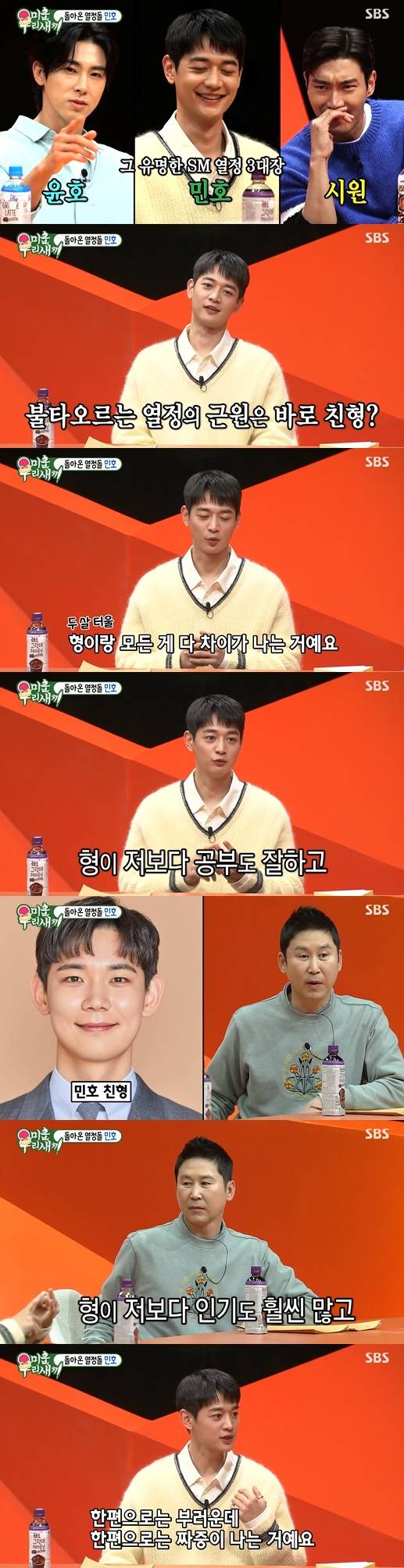 이에 민호는 "제 승부욕의 근원지가 형이다. 모든 게 저보다 다 낫다. 제가 봤을 때 저보다 더 잘 생겼다. 형은 늘 전교 10등 안이었다. 부러우면서도 짜증이 났다. 제일 크게 싸운 적은형 옷을 뺏어 입었을 때였다"고 고백했다.