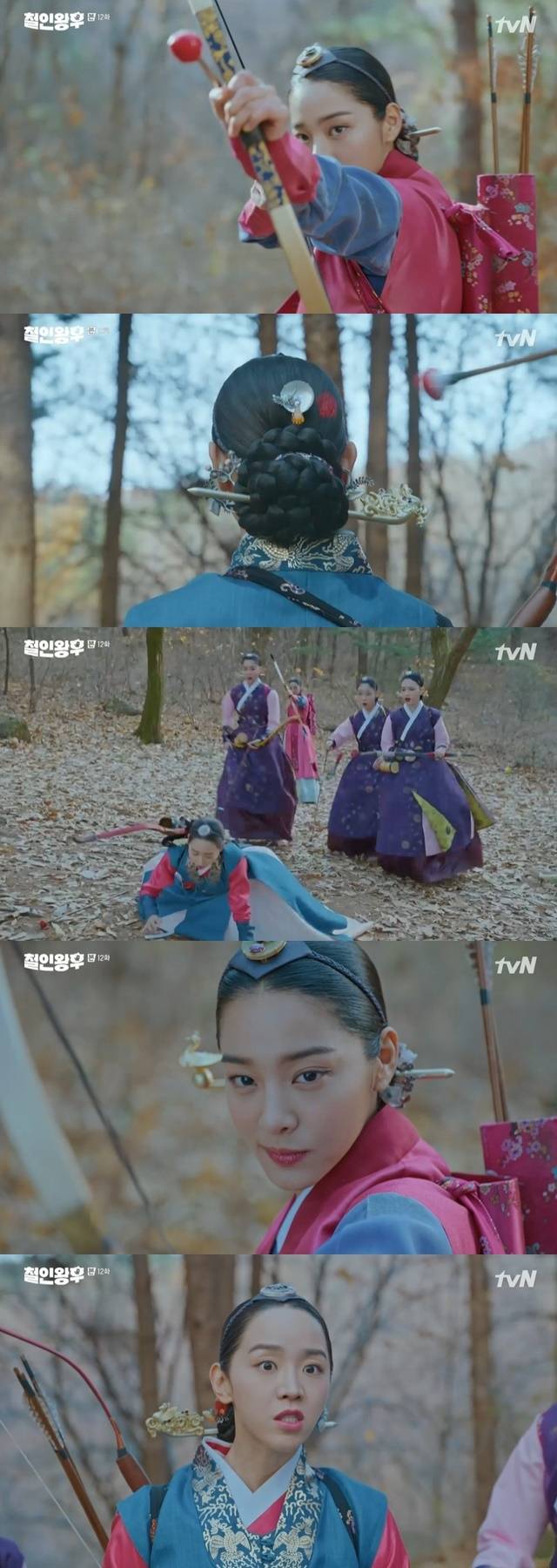 김소용이 설득을 포기하고 돌아서자 조화진은 사냥감을 쏘는 물감 활로 김소용의 머리를 맞추고 “송구하옵니다. 손이 미끄러져”라고 거짓말했다. 김소용은 “겁나 아프다”며 사냥감이 된 궁인들의 마음을 이해했다. (사진=tvN ‘철인왕후’ 캡처)