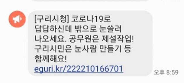 구리시청은 오후 8시59분경 "코로나19로 답답하신데 밖으로 눈쓸러 나오세요. 공무원은 제설작업! 구리시민은 눈사람 만들기 등 함께 해요"라는 메시지를 발송했다. 해당 재난문자는 구리시민 뿐 아니라 인근 광진구 등 시민들에게도 보내졌다.