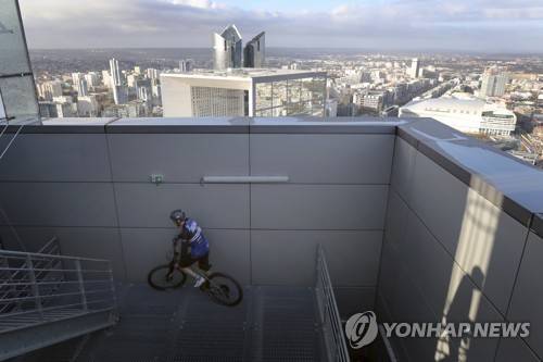 French rider Aurelien Fontenoy climbs the 768 steps of the 33 floors of the 140-meter-high Trinity Tower in the business district of La Defense, west of Paris, Sunday, Jan.17, 2021. Fontenoy performed the climb for an association, Reves, who help ill chidren. (AP Photo/Christophe Ena)
