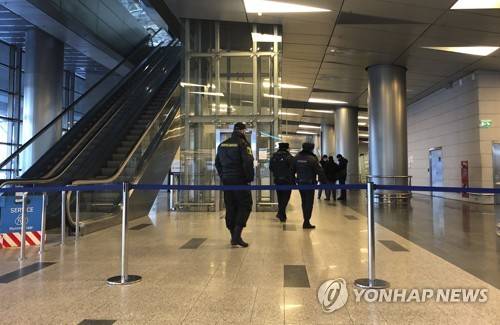 Police patrol the arrivals hall prior to Alexei Navalny's arrival, in Vnukovo airport outside Moscow, Russia, Sunday, Jan. 17, 2021. Leading Kremlin critic Alexei Navalny plans to fly home to Russia on Sunday after recovering in Germany from his poisoning in August with a nerve agent. (AP Photo/Alexander Zemlianichenko)