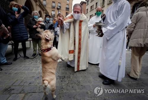 epa08943574 A dog is blessed by a priest outside St Nicholas church to mark St. Anton Day in Pamplona, Navarra, northern Spain, 17 January 2021. Each 17 January, pets and animals are blessed to be healthy during the year to mark St. Anton or St. Antonio Abad Day, the animals patron saint. EPA/Villar Lopez
