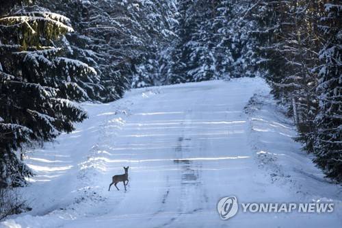 A roe deer moves across a snowy village road, as temperatures dipped to minus 21 degrees Celsius (minus 5.8 degrees Fahrenheit) near the town of Ignalina, some 120km (74,5 miles) north of the capital Vilnius, Lithuania, Sunday, Jan. 17, 2021. (AP Photo/Mindaugas Kulbis)
