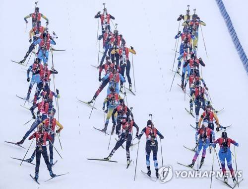Athletes compete during the women's 12.5km mass start race at the Biathlon World Cup in Oberhof, Germany, Sunday, Jan. 17, 2021. (AP Photo/Matthias Schrader)